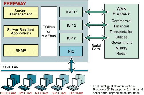 Freeways are based on a multi-processor architecture and highly integrated server software. The WAN serial ports are managed by Intelligent Communication Processor boards (ICPs); each ICP has its own CPU and memory. LAN communications are provided by a powerful CPU on the motherboard which assembles WAN data into packets and distributes it to users on the LAN.